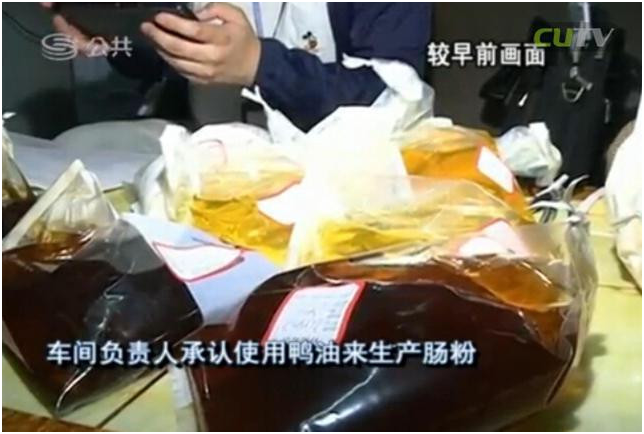 在執(zhí)法人員查獲6桶來歷不明的油之后,車間負責(zé)人承認使用鴨油來生產(chǎn)腸粉?!斑@是什么油?”“是鴨油?!薄翱绝喪O碌哪欠N?”“對。”