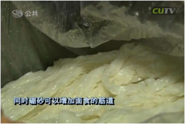 據(jù)了解,硼砂是一種易溶于水的工業(yè)原料,因毒性較高,廣泛用于殺菌殺蟲劑的生產(chǎn)。人體過多食用后,會引起多臟器的蓄積性中毒。同時,硼砂可以增加面食的筋道,因此成為黑心廠商的違法添加物。目前,食品廠法人以及相關(guān)負責(zé)人已被刑拘。