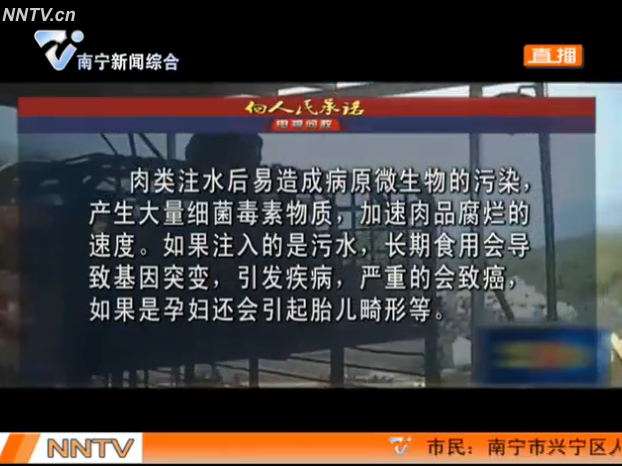 南寧市食品藥品監(jiān)督管理局局長黃明瑞回應(yīng):對于注水肉的問題,我們從改革以來就一直堅(jiān)持打擊,特別是今年夏季針對肉類食品進(jìn)行了大規(guī)模的整治行動,發(fā)現(xiàn)問題后馬上進(jìn)行懲處。首先我們要從源頭上杜絕注水肉,第二,肉類在進(jìn)入市場要進(jìn)行檢驗(yàn)檢測,合格以后才能上市銷售,市場開放方要建立查驗(yàn)查證制度,作為監(jiān)管部門要加大巡查力度,發(fā)現(xiàn)有違法添加的要立案進(jìn)行查處。