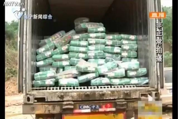 5月7日上午11點(diǎn)30分,劉圩鎮(zhèn)覃坡一處廢棄的木片廠區(qū)內(nèi),兩輛玉林牌照的紅色集裝箱貨車停放在空地,幾個貨車司機(jī)邊觀望邊等待。兩小時后,一輛藍(lán)色大貨車開進(jìn)廢棄廠區(qū),并與其中一輛集裝箱貨車尾對尾交接。