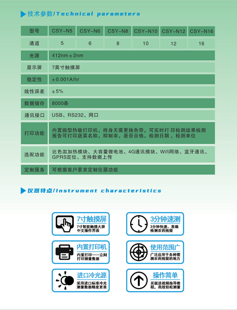 深芬儀器生產(chǎn)的新一代智能型農(nóng)藥殘留快速檢測(cè)儀是根據(jù)農(nóng)業(yè)標(biāo)準(zhǔn)方法(NY/T 448-2001)和國(guó)標(biāo)(GB/T5009.199-2003)中的酶抑制率法,嚴(yán)格遵循《GB/T5009.199-2003蔬菜中有機(jī)磷和氨基甲酸酯類農(nóng)藥殘留快速檢測(cè)方法標(biāo)準(zhǔn)》中的規(guī)定對(duì)蔬菜、啤酒等各種食品及原料中有機(jī)磷和氨基甲酸酯類農(nóng)藥殘留的快速檢測(cè)。