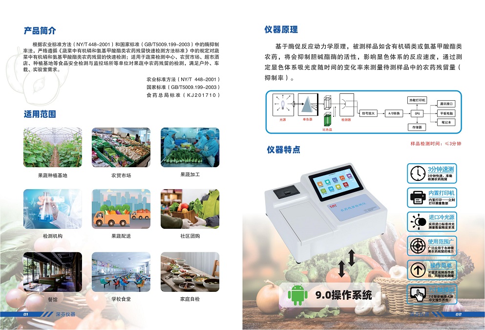 深芬儀器生產的安卓智能型農藥殘留測定儀;是根據農業(yè)標準方法(NY/T 448-2001)和國家標準(GB/T5009.199-2003)中的酶抑制率法,嚴格遵循《GB/T5009.199-2003蔬菜中有機磷和氨基甲酸酯類農藥殘留快速檢測方法標準》中的規(guī)定對蔬菜中有機磷和氨基甲酸酯類農藥殘留的快速檢測??蓮V泛應用于各級蔬菜檢測中心、農貿市場、超市、環(huán)保機構、蔬菜種植基地、飯店、車載及實驗室等食品安全檢測與監(jiān)控場所等單位對果蔬中農藥殘留的檢測。農藥殘留測定儀能準確、快速檢測出蔬菜、水果、糧食、茶葉以及土壤中有機磷和氨基甲酸脂類農藥殘留的快速檢測。